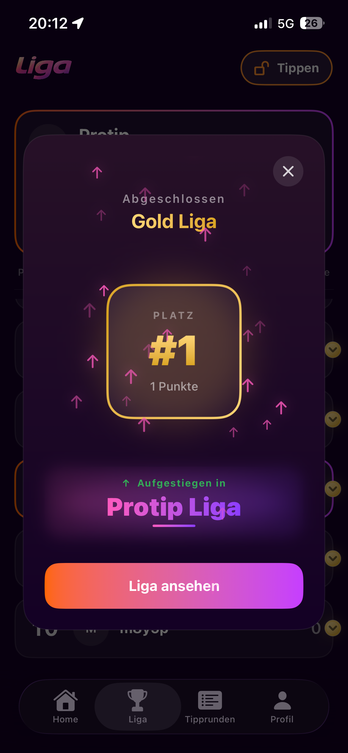 Protip kombiniert klassische Fußball-Tipps mit einer spielerischen Liga-Struktur. Du tippst nicht nur Ergebnisse – du verteidigst deinen Platz, jagst den Aufstieg und kämpfst gegen deine Freunde um jede Tabellenposition.